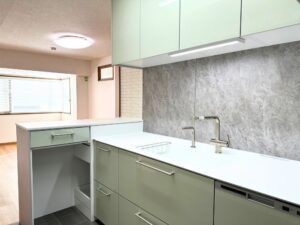 さらに、キッチンではアイランドキッチン背面の収納を造作家具と一体に見えるよう仕上げ、空間全体に統一感とデザイン性を持たせました。