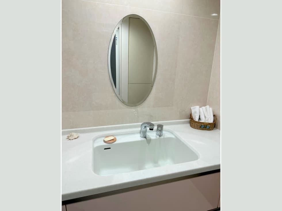 洗面所は白と薄いピンクを基調にし、清潔感があり、湿気や暗さを感じさせない仕上がりです。鏡の壁面収納をなくして鏡のみとしたことで、空間がすっきりと広く使えるようになりました。