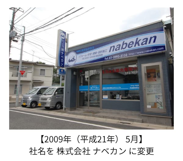 【2009年 5月】 社名を 株式会社 ナベカン に変更、本社を現在地に移す