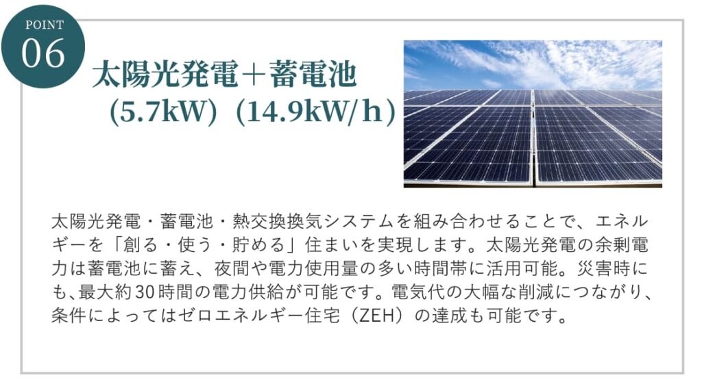 POINT: ZEH(ゼロ・エネルギー・ハウス)の達成も可能 太陽光発電と蓄電池、熱交換換気システムを組み合わせることで、災害時には最大約30時間の電力供給が可能です 。